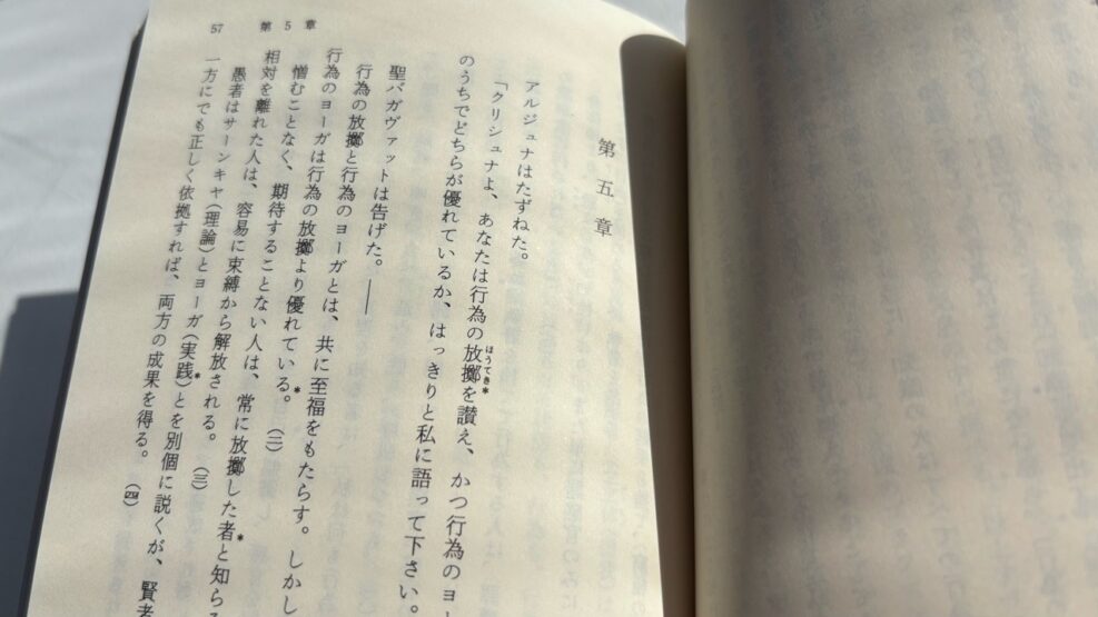 バガヴァッド・ギーターでクリシュナが言っている「行為の放擲」というのは、「行為そのものの放擲」ではなく、「行為を自分がしている」という思いと「その行為による結果」の放擲のこと。
