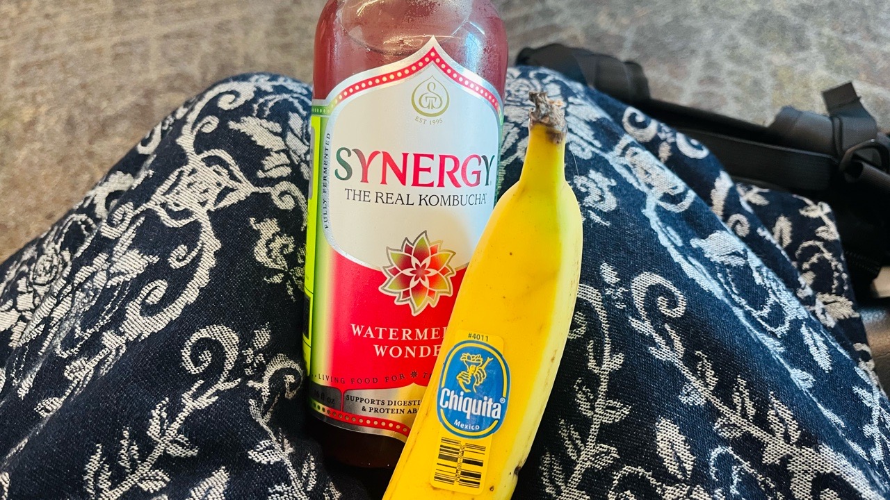 アメリカの空港の片すみに座り、「人生初のアメリカで自分で買ったコンブチャとバナナ」をもぐもぐしております、わたくし多神和でございます。どうもどうも。