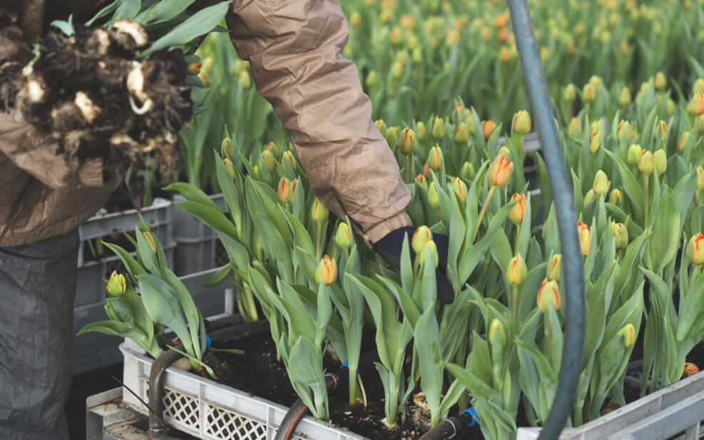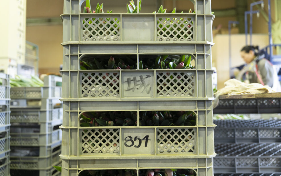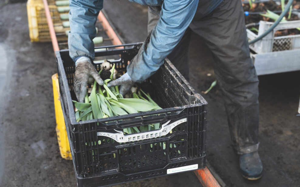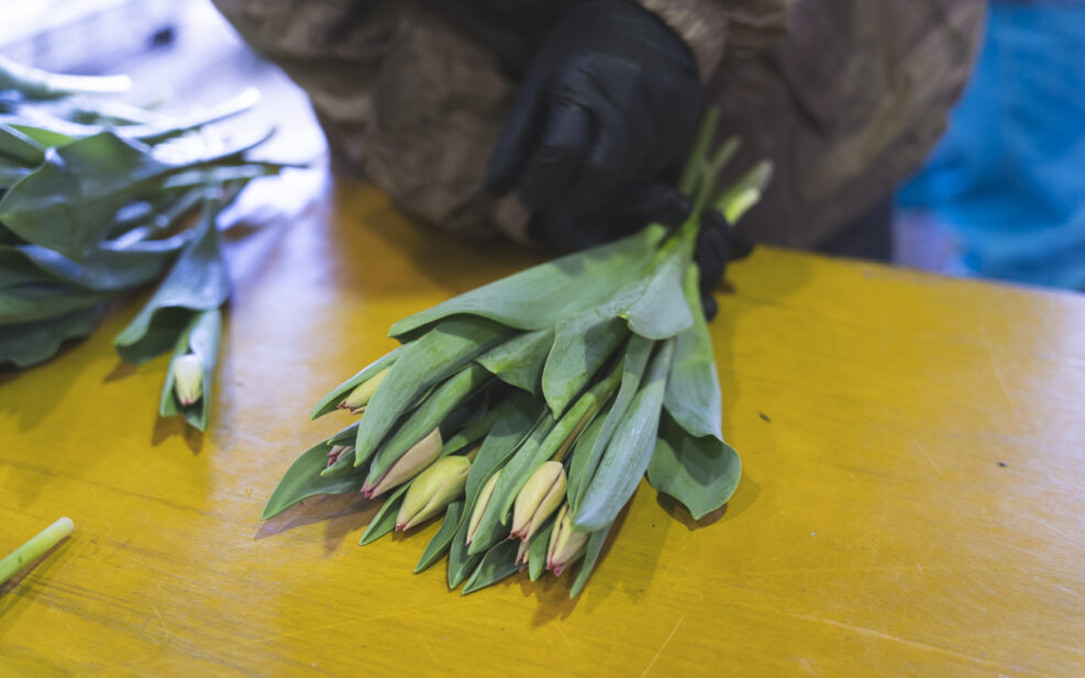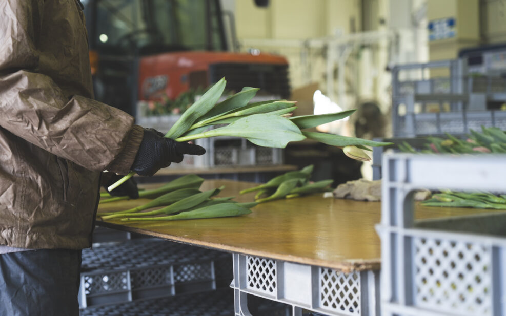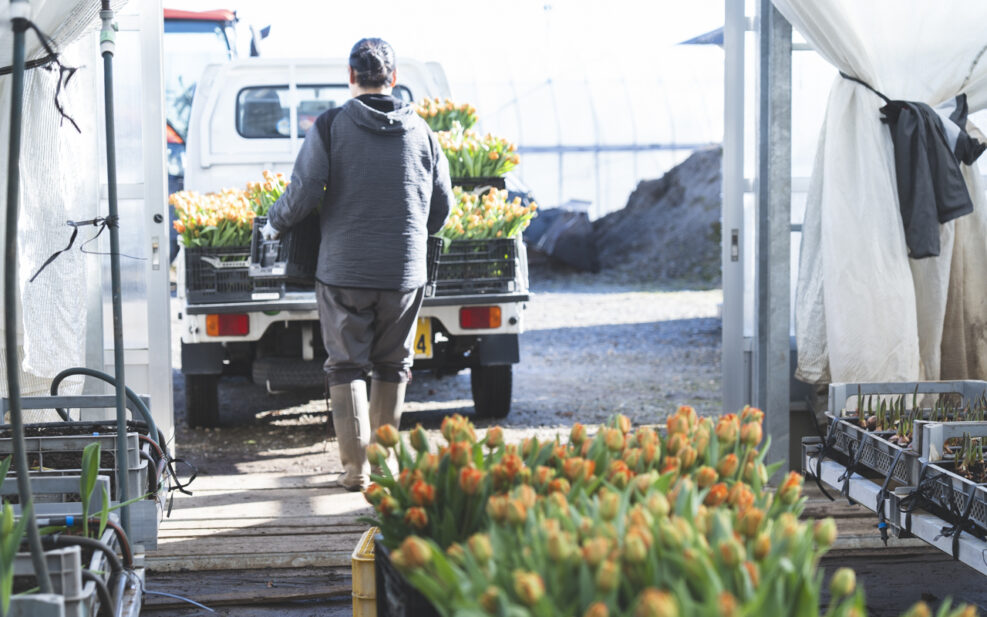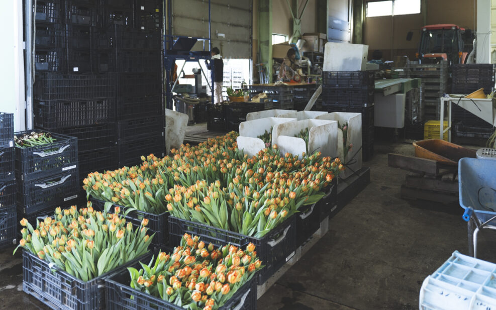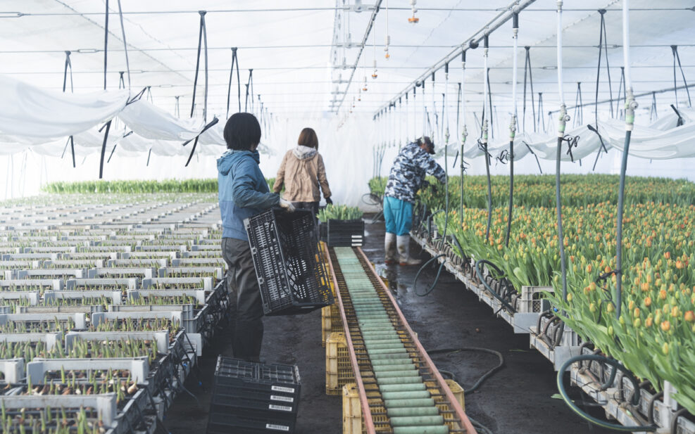 トラックで作業場まで運ばれたチューリップは、ここから分業で、出荷できる状態へと進めていく。