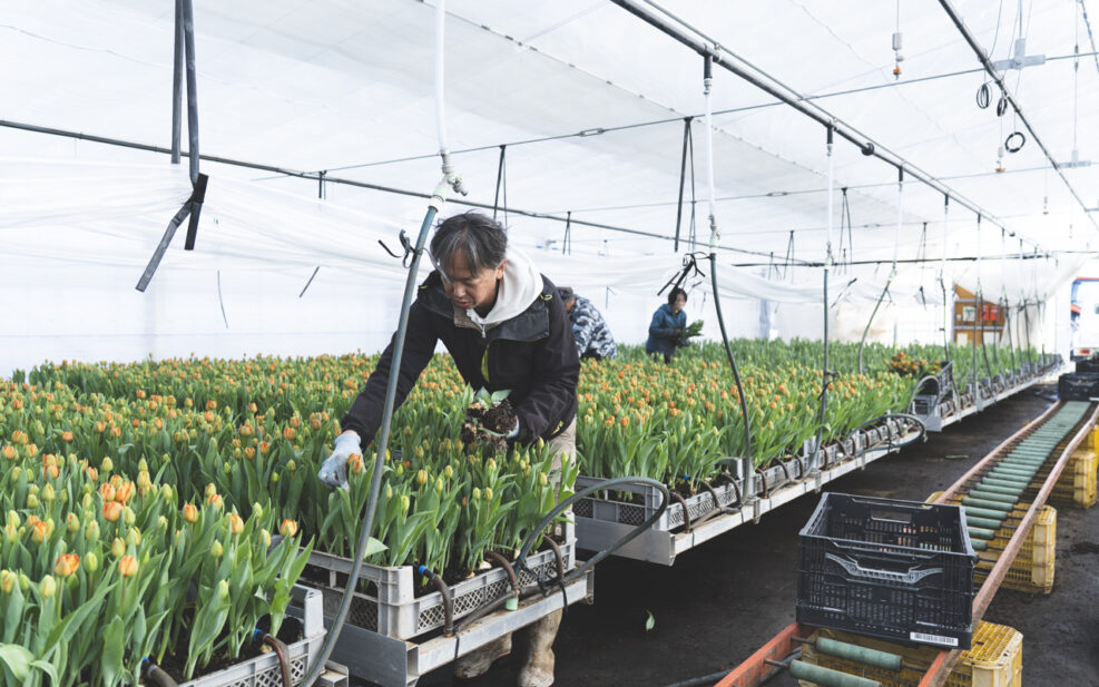 高岡市内のチューリップ農園では、繁忙期らしく出荷作業が続いていた。