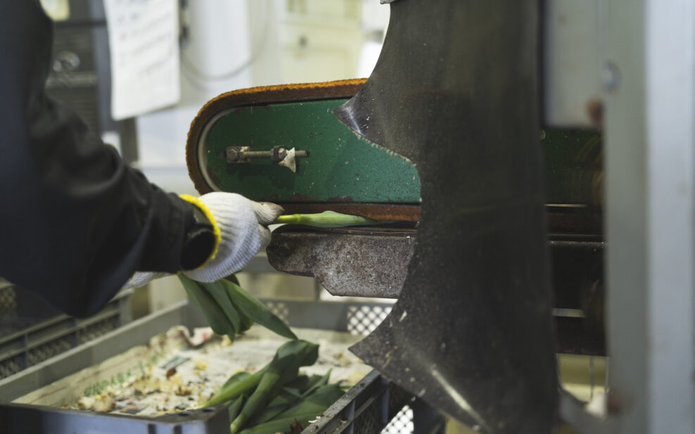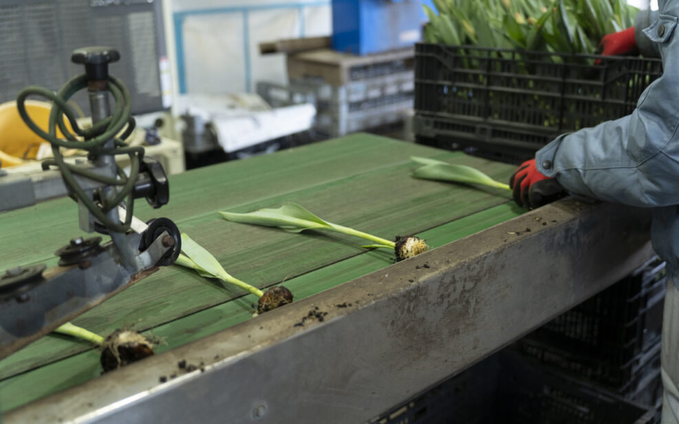まず、摘み取られたチューリップがコンベアに乗せられる。