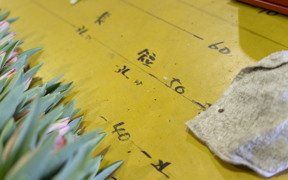 作業台の上には、長さの目安が書かれているけれど、実際に目の前の花を選別するのは簡単ではなさそうだ。ほんのわずかな違いを見極めながら、迷いなく手が伸びていく。