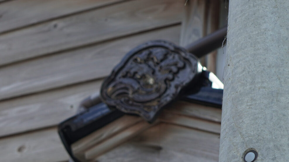 最後にもうひとつ。雨樋の壁面取り付け部分に、丸い彫刻のついた平たい瓦が貼り付けてあるのを見つけた。ピントが合ってないのはお気になさらないでいただきたい。